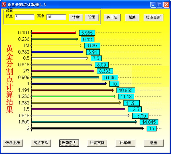只需输入上一波行情的高点和低点,即可算出黄金分割法的各个点位(也包括其它关键位置 比如1/3 、1/2、2/3等),计算非常方便。