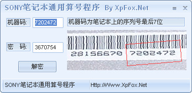 SONY索尼笔记本通用BIOS算号工具,解密索尼笔记本BIOS默认密码的算号工具,输入序列号,就能算出来BIOS的密码。虽然很简单但是很强大。