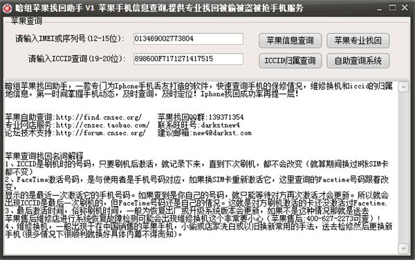 官方介绍:暗组苹果找回助手一款专门为Iphone手机丢友打造的软件,快速查询手机的保修情况,维修换机和iccid的归属地信息,第一时间掌握手机动态,及时查询,及时定位!Iphone找回成功率再提一层!