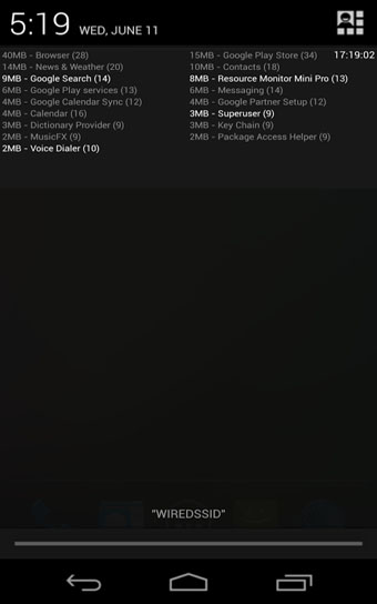 这是一个迷你资源监视器。它监测可用内存容量(MB)、CPU使用率(%)、CPU温度、CPU频率和迷你进程列表(通知面板)。它会经常显示在屏幕上。您可以指定显示在那一个角落、使用不同大小、的颜色、透明度等。这样便可以大大减低手机变慢的机会!