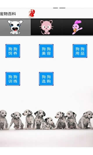 该应用以宠物为素材,分为:狗狗、猫猫、其它宠物三大类。每种类别中分为饲养、美容、训练、选购等。
