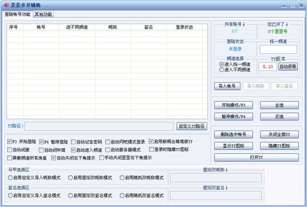 随风YY辅助工具是玩YY必不可少的工具之一。软件可用于YY频道马甲的修改,更有全自动刷花功能,YY无限多开,让你的YY挂机起来更给力。 随风YY辅助工具功能支持如下: 一:全自动刷花 二:批量改马甲 三:实现YY多开