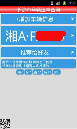 增加车辆信息:输入车辆的号牌号码和车辆的发动机号后5位,软件保存输入的信息,方便下次查询使用。在主界面会看到车牌号码,点击直接查询车辆的基本信息及车辆的交通违法信息。增加的快捷按钮长按之后可以看到删除和编辑,当输入的信息有误时可以进行删除或编辑。