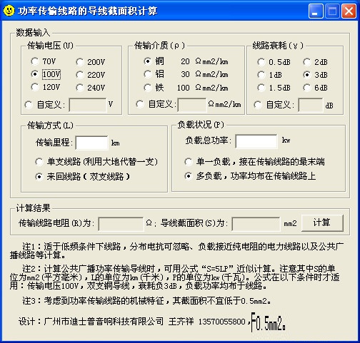 传输导线截面计算软件是一款定压公共广播截面计算软件,可以根据传输电压,介质、线路衰耗、传输里程、负载总功率等来计算出线路的电阻和导线截面积。