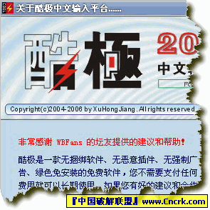 酷极中文输入平台是一个通用的外挂式中文输入平台。形码、音形码、形音码等编码方案的输入法均可挂接到本平台上,同时可提供辅助编码方案(如拼音)进行辅助输入。
