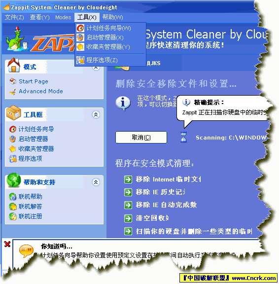 Zappit System Cleaner 是一个可以帮助你安全的移除计算机中的垃圾和无用文件,加速计算机运行的工具。它可以清理各种垃圾文件,管理和排序开始菜单、收藏夹、启动程序,让你获得更大的可用空间并优化系统。