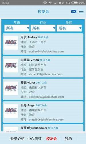 爱贝新闻可以让我们时时了解爱贝的每一天,有各地中心开业、有培训毕业典礼、有中心活动组织、有SpeakOut和海外游学,丰富的爱贝,成长的爱贝!视频中心是爱贝人的视觉盛宴,包含了宣传片、活动、年会、大赛、培训、加盟商风采和爱贝人风采七个部分。(很可能在视频中就出现了与众不同的你呦~)爱贝课程中体现了课程综合介绍、各级别课程一目了然。讲完了第一个板块,让我们看看校友会功能,在这里,我们可以根据加入爱贝的年份、加入爱贝前或目前的所处行业、以及地区进行筛选。同一个爱贝,同一个梦想,在这里,是否有你想了解的那个她(他)呢?CDClub的最后一个功能是“我的My”,在个人中心里,你可以修改自己的照片、自我介绍、选择爱贝的理由和期待在爱贝的收获。