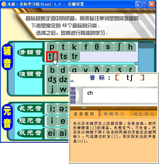 水淼音标学习机主要提供48个音标列表及对应发音,鼠标指向音标可对应发音,并且还可以查看音标发音规则和举例。