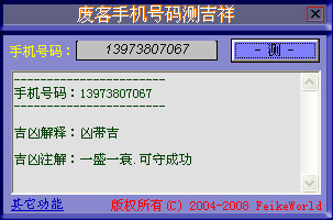 废客手机号码测吉祥 1.1绿色免费版 手机号码免费测吉凶,换手机号码之前用废客手机号码测吉祥来测测吧,纯属娱乐么,最好能一笑而过。