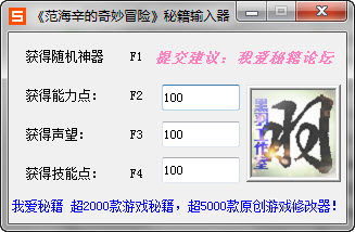 范海辛的奇妙冒险秘籍输入器是同名游戏的辅助工具,帮助自动输入作弊码达到修改游戏的功效!|修改项目:F1 获得随机神器F2 获得能力点F3 获得声望F4 获得技能点
