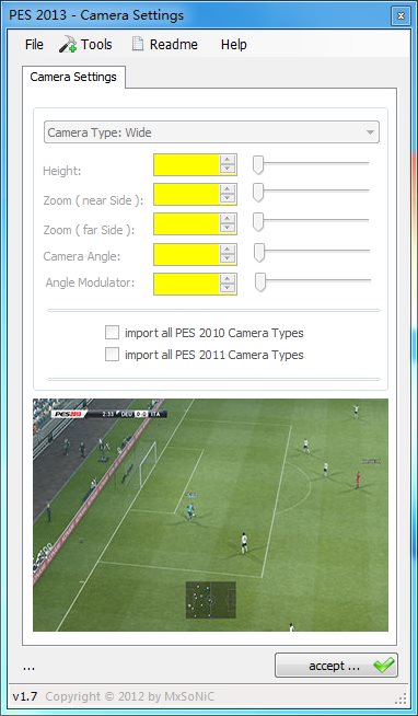 实况足球2013视角调整及设置解锁工具 v1.7.1 绿色版 实况足球2013视角调整及设置解锁工具是为同名游戏制作的游戏设置解锁工具。