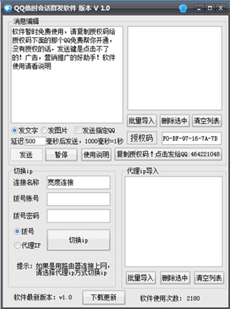 qq临时会话群发软件 2.0 绿色免费版 qq临时会话群发软件是一款可以帮助用户进行QQ临时会话群发的软件,您也可以用于淘宝店铺引流量、广告宣传、做CPA等,无需输入验证码也无需更好IP,非常给力。qq临时会话群发软件的优势在于可以日发5万,而且全自动不会封杀QQ、不会冻结QQ,不会屏蔽消息。