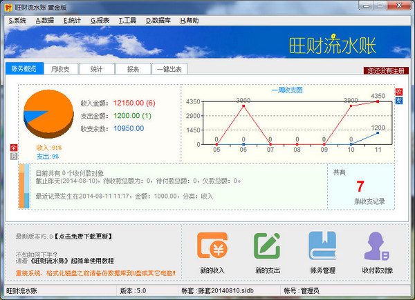 管理您在日常生活中的现金收支,可建立多个帐套、无限自定义分类,多种图形统计及账务报表,并可通过插件不断增强扩展软件功能。默认帐套管理员登录密码为空。
