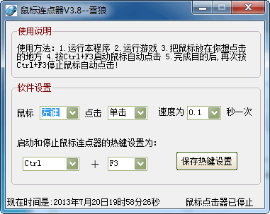 雪狼鼠标连点器将可以解放你的手指啦!只要按下热键,让鼠标自动点击器帮你点击吧!鼠标点击速度可以调节,鼠标左键右键也可以选择。所有游戏通用,最快速度0.1秒点击1次!使用方法超级简单!