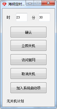 海明定时关机软件是一款可以设定固定时间,执行关机命令的一款软件。只需在软件界面里,手动输入您需要关机的时间,并点击执行按钮。到时后,软件就会自动关闭您的计算机。