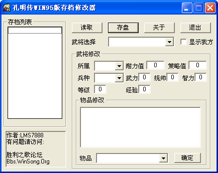 孔明传修改器存档修改器,能进行武将属性修改,让您轻松的完成游戏 使用说明 运行修改器,读取存档,存档位置在游戏安装目录下的存档文件里