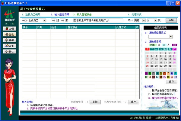 1、辅助日常特殊出勤状况登记(如特殊原因漏打或值日登记等)。