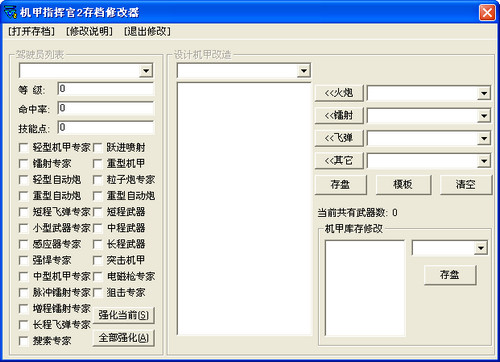 机甲指挥官2修改器存档修改器,能修改各项属性,技能,和等级 使用说明 运行修改器,从修改读取游戏存档,然后进行修改,修改完成后记得保存下,存档位置在游戏安装目录下的存档文件夹里