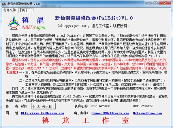 新仙剑超级修改器是一款《新仙剑奇侠传》修改器。通过本软件,您可以对“新仙剑奇侠传”中的金钱、27种特定场合使用的道具、112种武器装备、101种使用物品及每位主人公的修行、经验值、体力值、真气值、武术值、灵力值、防御值、身法值、吉运值,及65种法术,总计318个项目进行随意设置,想怎么改,就怎么改!!!