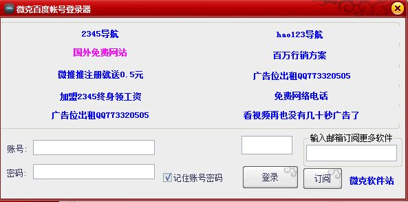 微克百度账号登录器 1.0 绿色版 微克百度账号登陆器是一款可以帮助用户循环登陆大量百度账号的工具,该工具可自动换ip,非常适合经常做百度知道、百度贴吧的用户,微克百度账号登陆器软件可以能快速升级百度帐号级别,做百度知道营销的必备软件。