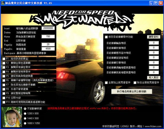 极品飞车9作弊器全称是極品飛車全民公敌中文修改器,先开游戏再开作弊器。。