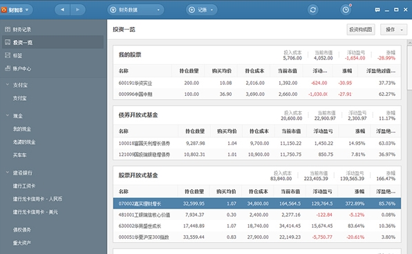 六、投资产品管理,集中管理股票、基金、证券等投资理财产品,随时掌控投资收益变化;