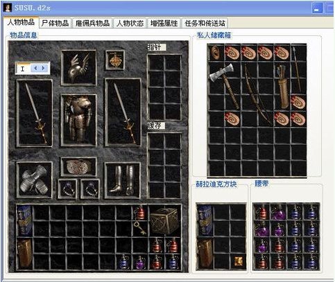 强大的暗黑破坏神2:毁灭之王各版本的修改器,提供物品的导入导出,人物属性修改,技能修改,雇佣兵修改,以及任务,小站的修改,并提供在修改器中显示物品属性等功能,全面支持最新的1.11版.