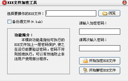 EXE文件加密工具可以给可执行的EXE文件加上一层密码保护,使之在运行前要验证密码,密码不符则拒绝执行。可以有效地防止非法用户使用部分程序。