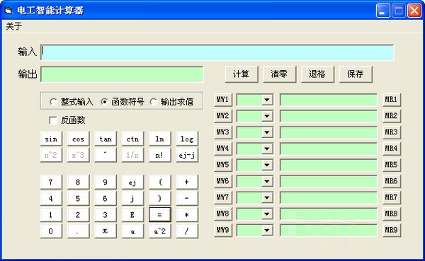 电工智能计算器专门针对电工计算中复杂的复数运算及常用函数设计,在输入框中可直接输入表达式即计算公式,按计算按钮或=计算出结果,可暂将结果保存,最多可同时保存9个中间结果,还可将计算结果保存至文件。