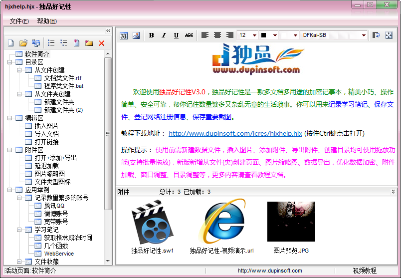 独品好记性是一款多文档多用途的加密记事本,精美小巧、操作简单、安全可靠,帮你记住数量繁多又杂乱无章的生活琐事;通过独品好记性下载你可以记录学习笔记、保存文件、登记网络注册信息、保存重要截图等。