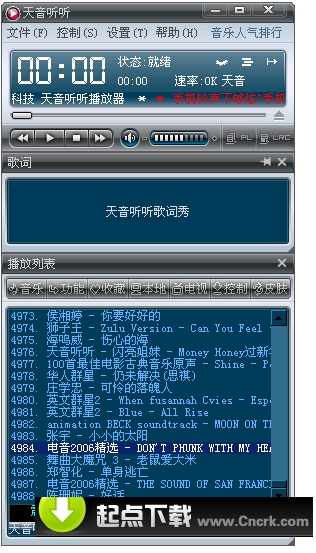 天音听听,一款全新的免费音乐播放软件在这个美丽的七夕节发布了.窗外雨声清澈明亮,但却比不上天音听听给你带来的震撼.它虽然只有3M多,却内置八万余首高品质音乐,包你听不够,听到爽,天音听听将是您电脑必不可少的音乐播放软件.从此你不必再去网上不停的下载音乐了,因为只要有了天音听听,所有的音乐都将尽收囊中,不需下载的烦恼,不怕病毒的侵扰.