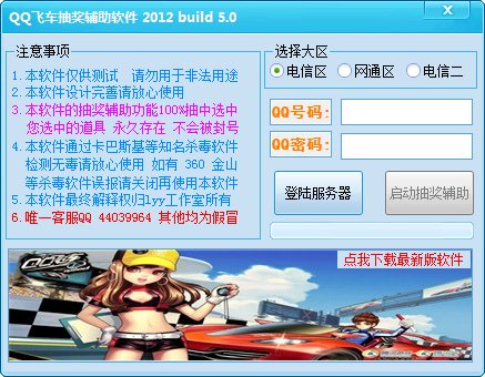 qq飞车抽奖辅助软件,可以提高qq飞车抽奖率,可以抽到永久银翼杀手,S迈凯轮,暴风雪,等等也祝你能抽到A,最好S。