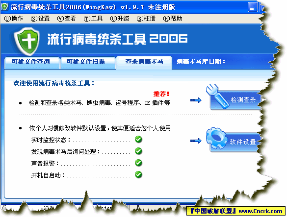 软件2003年发布以来,数年间经历了大量的实践使用测试,到目前为此已知可清除国内外木马8690余种;蠕虫病毒、恶意程序3600余种,QQ尾巴680余种;恶性IE插件300余种。是保护您系统安全的必备软件。