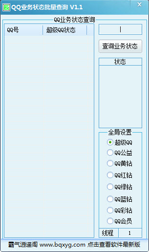 QQ业务状态批量查询 1.1 绿色版 QQ业务状态批量查询是一款QQ业务状态批量查询软件支持多线程操作,可以一键查询任意QQ的业务开通和图标点亮情况。