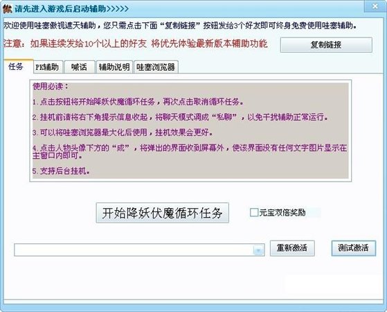 哇塞傲视遮天辅助是一款减轻游戏者体力的傲视遮天辅助器。可以实现自动pk,喊话等功能。