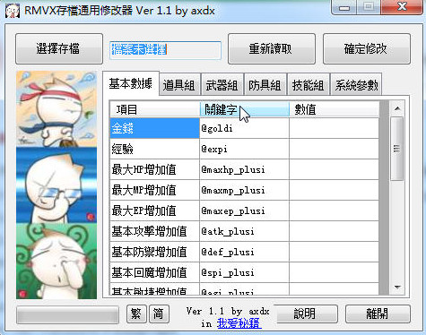 使用方法 该修改器为游戏存档多功能修改器,主要更改项为:基本数据 道具组 武器组 防具组 技能组 系统参数