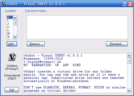 vSubst是一个32Bit的SUBST,可以把任何文件夹虚拟成硬盘驱动器,当然也很容易的清除所有虚拟盘。
