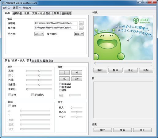 Altarsoft Video Capture是一款很棒的视频捕捉和重新编码工具,已汉化成中文,抓图,录像功能不在话下。