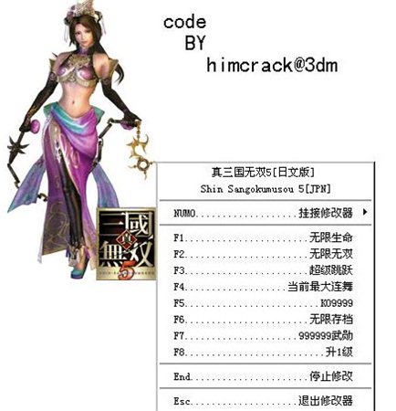 真三国无双5修改器可修改无限生命、无限存档、超级跳跃等游戏数据,设置体力无限、无双无限、一击必杀等作弊功能,真三国无双5修改器是同名游戏辅助,您可以免费下载。