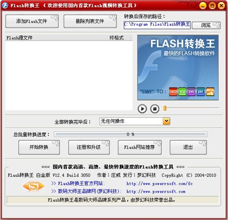 Flash转换王是国内首个可以将Flash的SWF动画转换为VCD/SVCD/DVD/MPEG1/MPEG2/压缩AVI/非压缩AVI以及应用于各种手机/MP4机/iPod/iTouch/iPhone/iPad/SONY PS3/魅族M8或M9/安卓手机等一系列视频格式的优秀转换工具,软件更支持直接提取Flash的SWF动画并转换为MP3/WAV等流行音频格式。这样您便可让Flash动画在家庭电视机上、在移动VCD/DVD机上、在车载媒体系统上、在各种手机/MP4机甚至是游戏机等各种终端硬件上自由共赏Flash精彩动画成为可能!