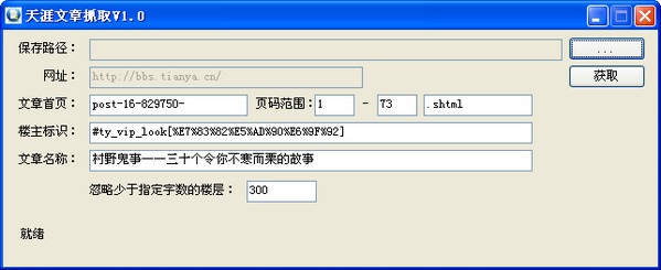 最近在天涯看鬼文,由于连载的,不方便看,就搞了个天涯文章抓取工具抓取下来存成txt,然后慢慢看。抓取了几篇看了下,还不错,有兴趣的试试吧。 用的时候把原界面的参数对应着替换掉就行了