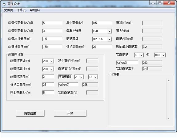 雨篷设计工具,结构人员使用,用于计算悬挑雨篷的弯矩、剪力及配筋,后继版本将陆续加入雨篷梁的抗弯及抗扭验算。