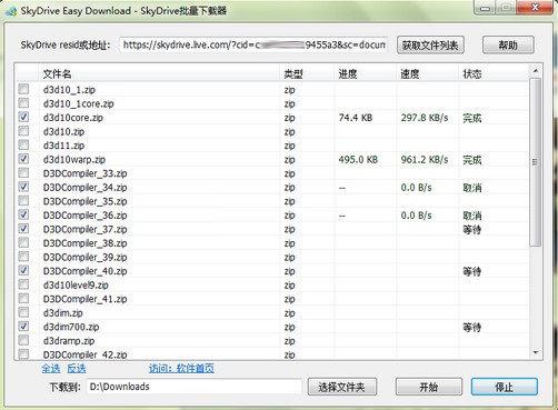 SkyDrive Easy Download 就是一个用来解决这个问题的免费软件,它提供批量下载功能,只要复制URL到本软件 -> 点击“获取文件列表” -> 勾选文件 -> 选择文件下载到的文件夹(可保持默认不改) -> 点击“开始” ,接下来就轻松的等待吧。