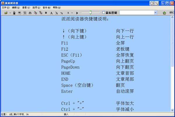 派派小说阅读器是一款功能一般的电子书阅读器,拥有大部分电子书阅读器的功能,派派小说阅读器的亮点是它可变速的自动滚屏功能,用户需要通过滑动条控制屏幕滚动速度,目前支持TXT、UMD、JAR、PDB、RTF、ZIP、RAR、DOC、EPUB等格式.