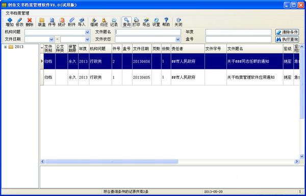 该系统根据国家档案局颁布的《归档文件整理规则》的行业标准,按照"简化整理,深化检索"以件为归档文件整理单位的思想开发设计,适合于各行政机关、企事业单位使用,并完全符合文书档案达标升级的要求,同时该系统也可作为资料信息电子化管理的工具。