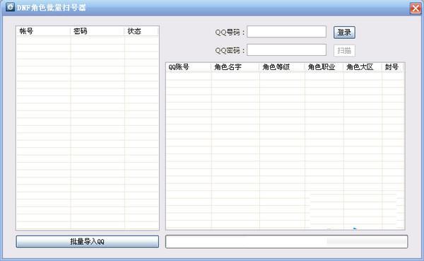 dnf角色批量扫号器可以批量的查询你的角色信息,包括名字、等级、职业、大区,以及是否封号等情况,操作便捷。 使用方法 开启软件后,直接输入QQ号码和密码,登录后即可查询角色信息,支持批量导入QQ号。
