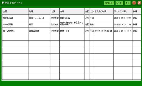 勇哥小助手可以帮您定时提醒、定时锁屏、定时关机、定时重启、定时执行某程序。可设置在某个时间点、或每天、或每星期几、或每隔多少分钟、或随开机启动执行。