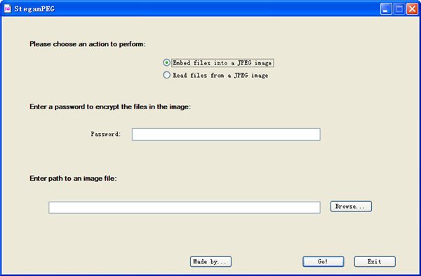 SteganPEG一个能在JPG图片中隐藏其它文件的加密工具。功能: 可以设置口令,没有口令即使是你自己也无法知道隐藏了什么内容。支持隐藏后再次压缩JPG图片