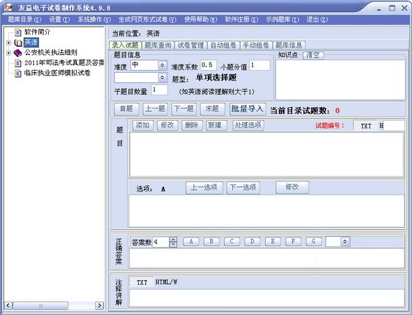 友益电子试卷制作系统 v4.9.8 绿色版 友益电子试卷制作系统集试题管理与生成电子试卷于一体,采用树形目录式结构管理,可自由设置目录结构;支持标准化试题及填空题等多种题型。