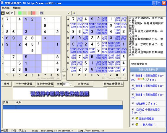 3.目前数独计算器采用的解题方法为典型的候选数法解题,新的解题方法会不断集成到这里,敬请持续关注。您有好的点子,也可以参与进来(数独论坛)。